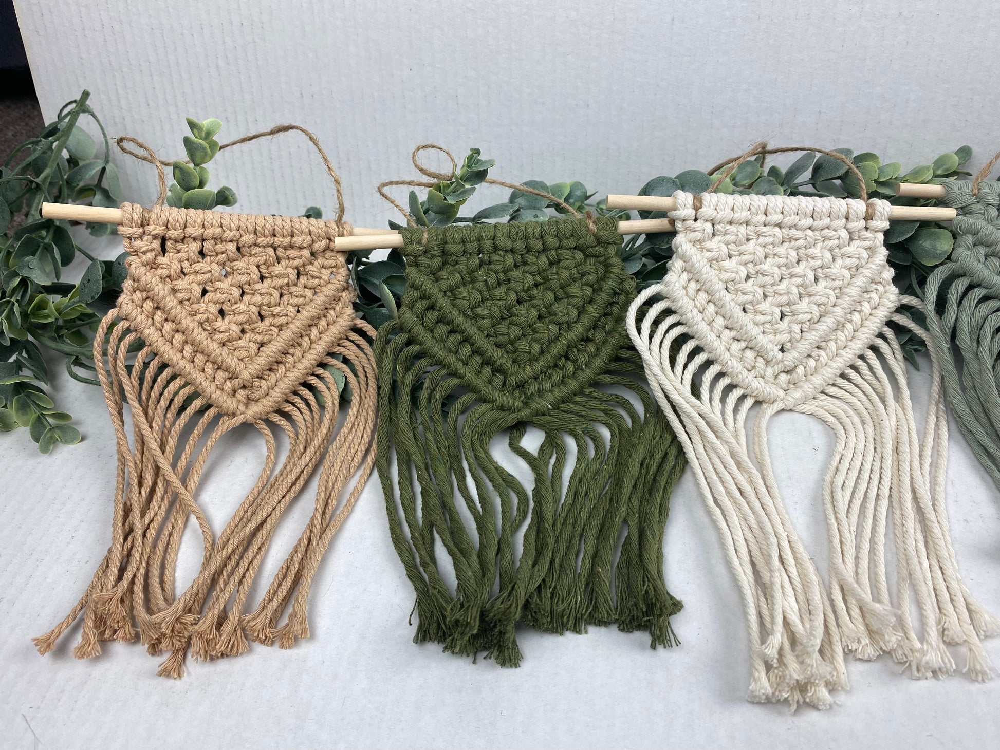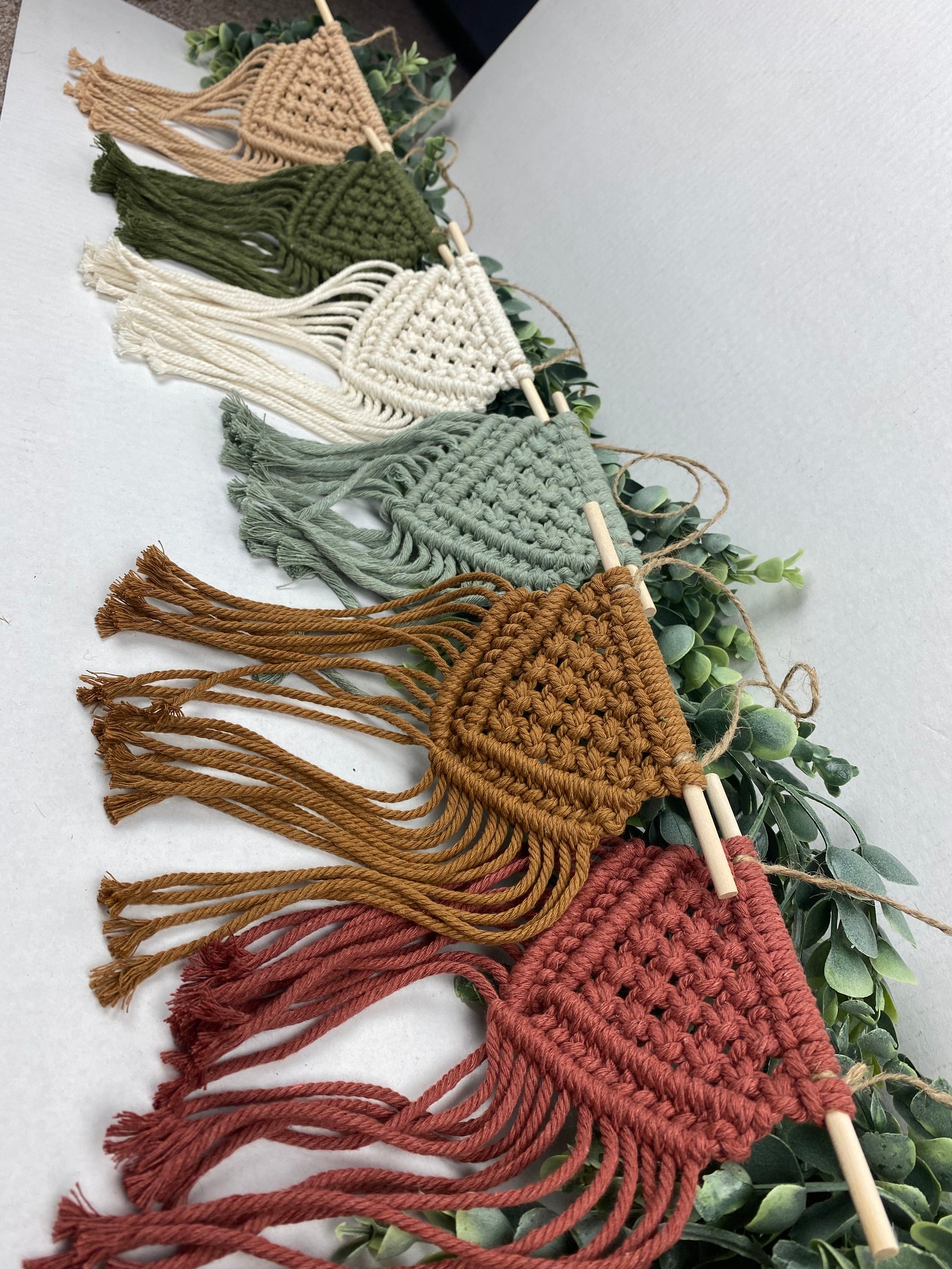 Each piece measures approximately 6" x 12" from the top of the twine cord to the bottom fringe and can be hung easily with a small nail.