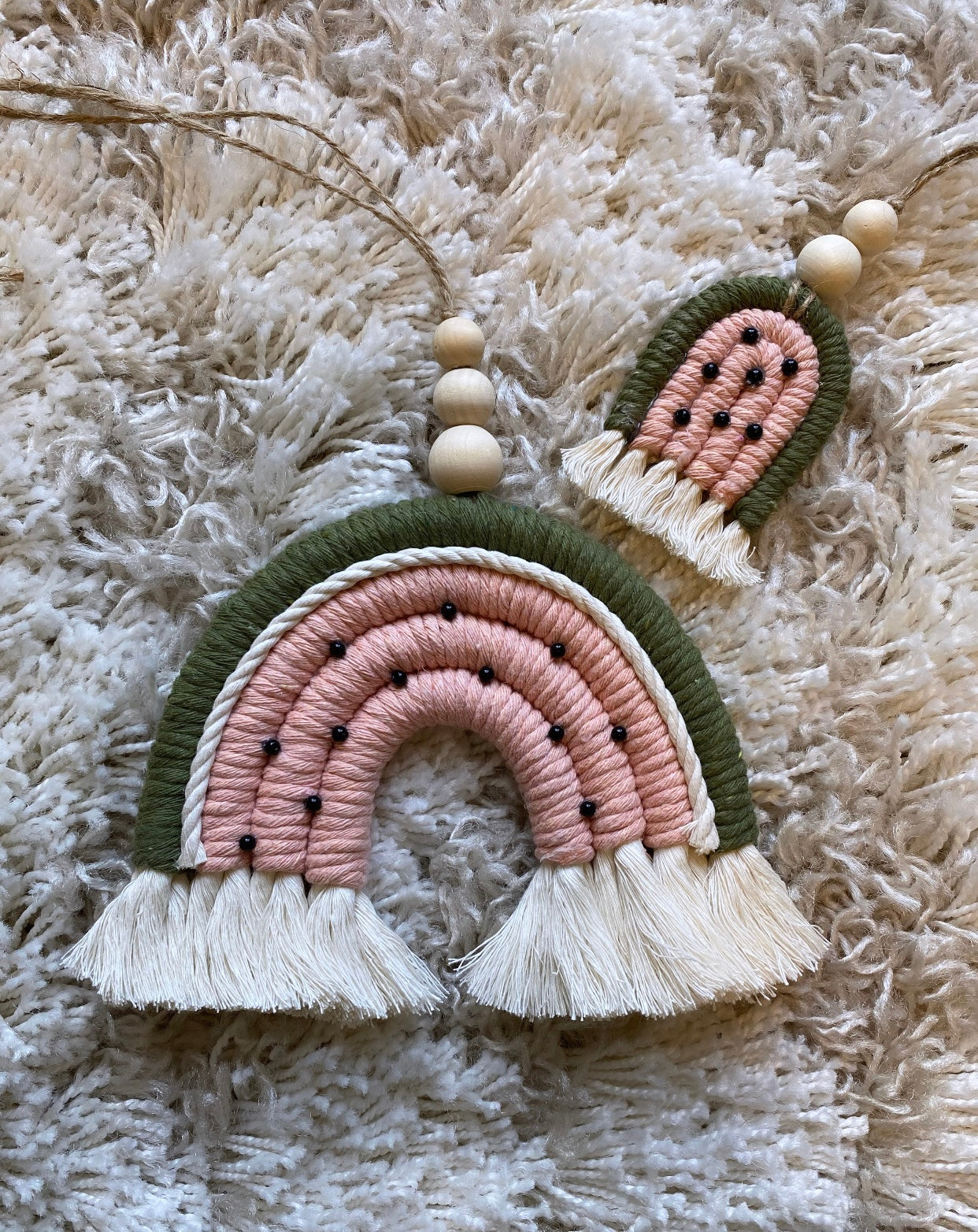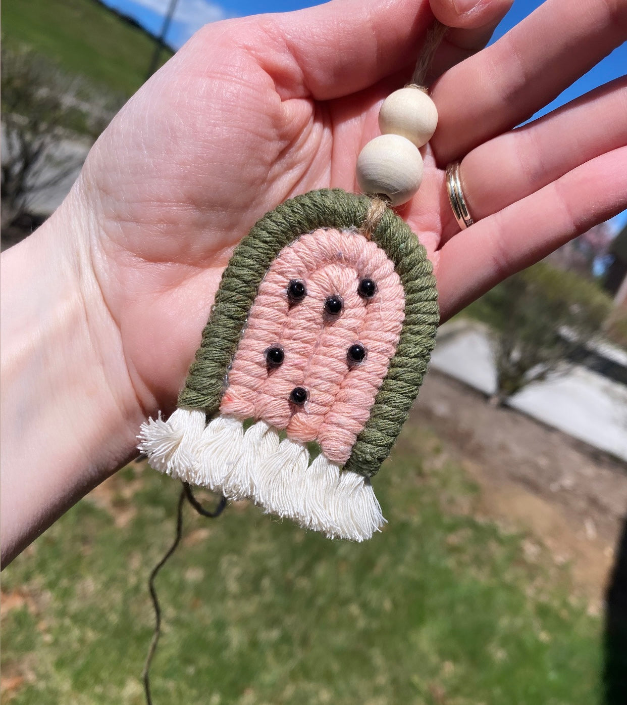 This handmade watermelon rainbow car charm is a trendy addition to hang in your car’s rearview mirror or as wall décor in your home! It looks great no matter which way you decide to hang it. Made with super soft cotton and comes with extra-long untied twine string so you can adjust to preferred length.